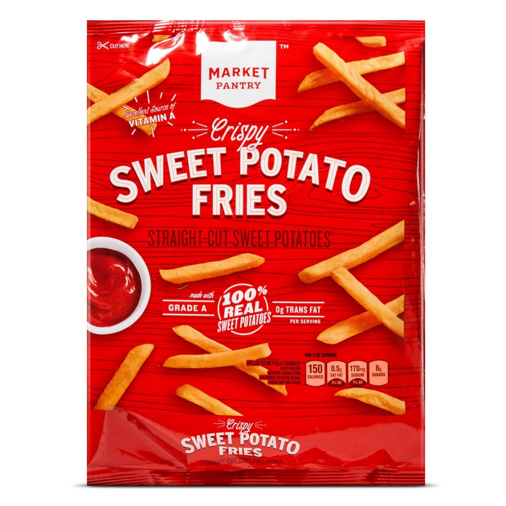 SWEET POTATOES, VEGETABLE OIL (CONTAINS ONE OR MORE OF THE FOLLOWING: HIGH OLEIC CANOLA, CANOLA, SUNFLOWER), MODIFIED FOOD STARCH (CORN, POTATO, TAPIOCA), SUGAR, RICE FLOUR, CORNSTARCH, DEXTRIN, SALT, LEAVENING (DISODIUM DIHYDROGEN PYROPHOSPHATE, SODIUM BICARBONATE), COLORING (ANNATTO, TURMERIC), DEXTROSE, XANTHAN GUM.