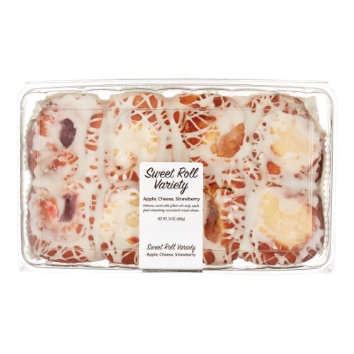 ENRICHED BLEACHED FLOUR (WHEAT FLOUR, ASCORBIC ACID (ADDED DOUGH CONDITIONER), NIACIN , REDUCED IRON, THIAMINE MONONITRATE, RIBOFLAVIN, FOLIC ACID), SUGAR, WATER, MARGARINE (PALM OIL, WATER, SALT, VEGETABLE MONOGLYCERIDES, WHEY SOLIDS, SODIUM BENZOATE (A PRESERVATIVE), NATURAL AND ARTIFICIAL FLAVOR, CITRIC ACID, BETA CAROTENE (COLOR), VIATMIN A (PALMITATE AND), MALTODEXTRIN, PARTIALLY HYDROGENATED SOYBEAN OIL, YEAST, EGGS, CONTAINS 2% OR LESS OF THE FOLLOWING: WHEAT GLUTEN, CALCIUM SALT, LACTALBUMIN, NONFAT MILK, WHEY, AMMONIUM SULFATE, SODIUM STEAROYL LALATE, DIMETHYLPOLYSILOXANE (ANTI-CAKING AGENT ADDED). CREAM CHEESE FILLING (PASTEURIZED MILK, AND CREAM, SOYBEAN OIL, POWDERED SUGAR, POWDERED LEMON JUICE (CORN SYRUP SOLIDS, LEMON JUICE SOLIDS & LENOIL), VANILLIN, FRUIT FILLINGS CONTAINS ONE OR MORE OF THE FOLLOWING: APPLES (PRESERVED WITH SODIUM SULFATE, APPLE JUICE, STRAWBERRIES, HIGH FRUCTOSE CORN SYRUP, WATER, CORN SYRUP,SUGAR, MODIFIED, CORN STARCH, GELATIN BLEND (XANTHAN GUM, LOCUST BEAN GUM, GUAR GUM), SALT, CITRIC ACID, PROPYLENE GLYCOL, POTASSIUM SORBATE AND SODIUM BENZOATE (AS PRESERVATIVES), SPICE, MALIC ACID, AGAR, NATURAL AND ARTIFICIAL FLAVOR, ARTIFICIAL COLOR (FD&C RED # 40).