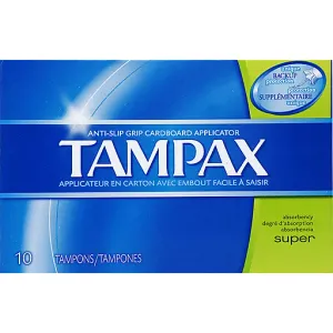 Tampax Cardboard Tampons Super Absorbency, Anti-Slip Grip, LeakGuard Skirt, Unscented, 10 Count