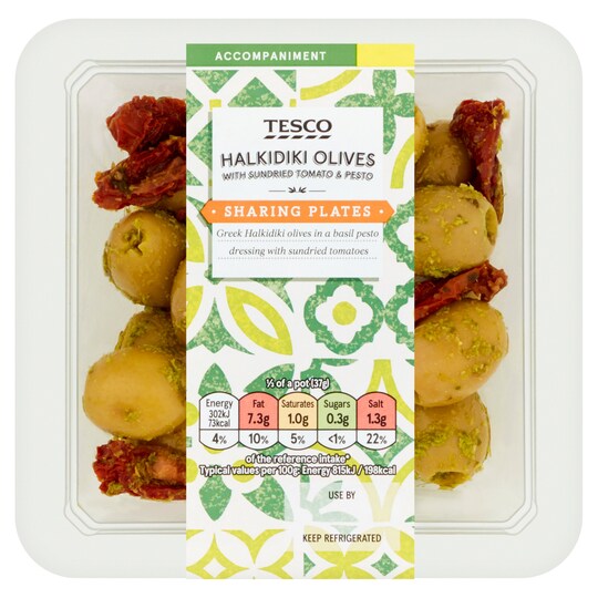Tesco Halkidiki Olives With Tom & Pesto 112G