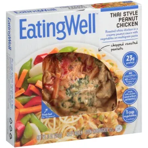 THAI STYLE PEANUT CHICKEN ROASTED WHITE CHICKEN IN A CREAMY PEANUT SAUCE WITH VEGETABLES ON MULTIGRAIN PASTA, THAI STYLE PEANUT CHICKEN