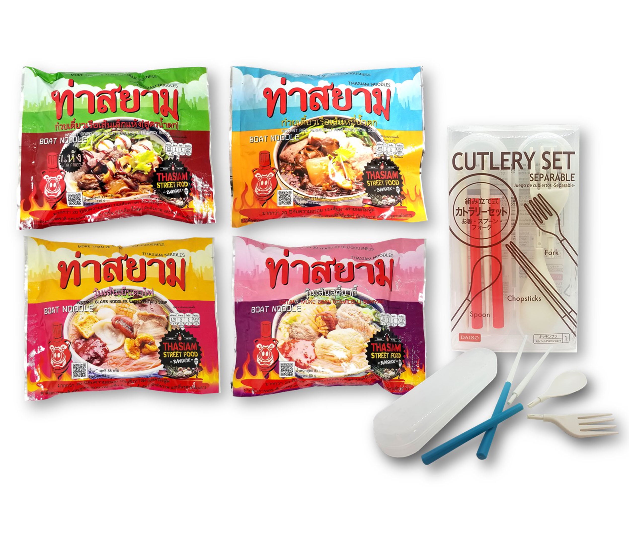 ThaSiam Thai Boat Noodles 4-Variety Sampler Pack 2 Each Flavor: Nam Tok, Nam Tok Herb Soup, Yen Ta Fo, and Sukiyaki 8 Packs plus 1 Interchangeable Cutlery Set