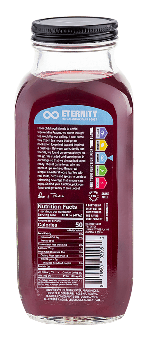 Filtered Water, Apple Pieces, Hibiscus, Elderberries, Rose Hip, Natural Flavors, Pomegranate Bits, Cornflowers, Blueberries, Agave, Lemon Juice Concentrate