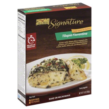 Tilapia, chopped spinach, roasted garlic parmesan butter sauce (natural flavors, dehydrated garlic, partially hydrogenated vegetable oil, [soybean, cottonseed], coconut oil, parmesan cheese [milk, salt culture, enzymes], salt, dehydrated onion, maltodextrin, whey protein concentrate, Romano cheese [pasteurized milk, cheese cultures, salt, enzymes], modified food starch, whey solids, sugar, yeast extract, parsley, sodium caseinate [a milk derivative], annatto extract, turmeric, and not more than 2% silicon dioxide added as a processing agent), cream cheese (cultured pasteurized milk & cream, salt, stabilizers [xanthan, locust bean & guar gum]), mozzarella cheese (pasteurized milk, cheese cultures, salt, enzymes, powdered cellulose and dextrose [added to prevent caking]), heavy cream (cream and less than 2% of [mono and diglycerides, carrageenan, polysorbate 80, cellulose gum, guar gum added as emulsifiers and stabilizers]), red peppers (diced red peppers, water, salt, citric acid, calcium chloride), olive oil blend (canola and/or soybean oil, extra virgin olive oil, beta carotene (color), grated parmesan cheese (pasteurized part skim cow’s milk, cheese culture, salt, enzymes, powdered cellulose [anti-caking agent], calcium propionate [preservatives]), kosher salt, whole leaf basil, garlic powder, black pepper.