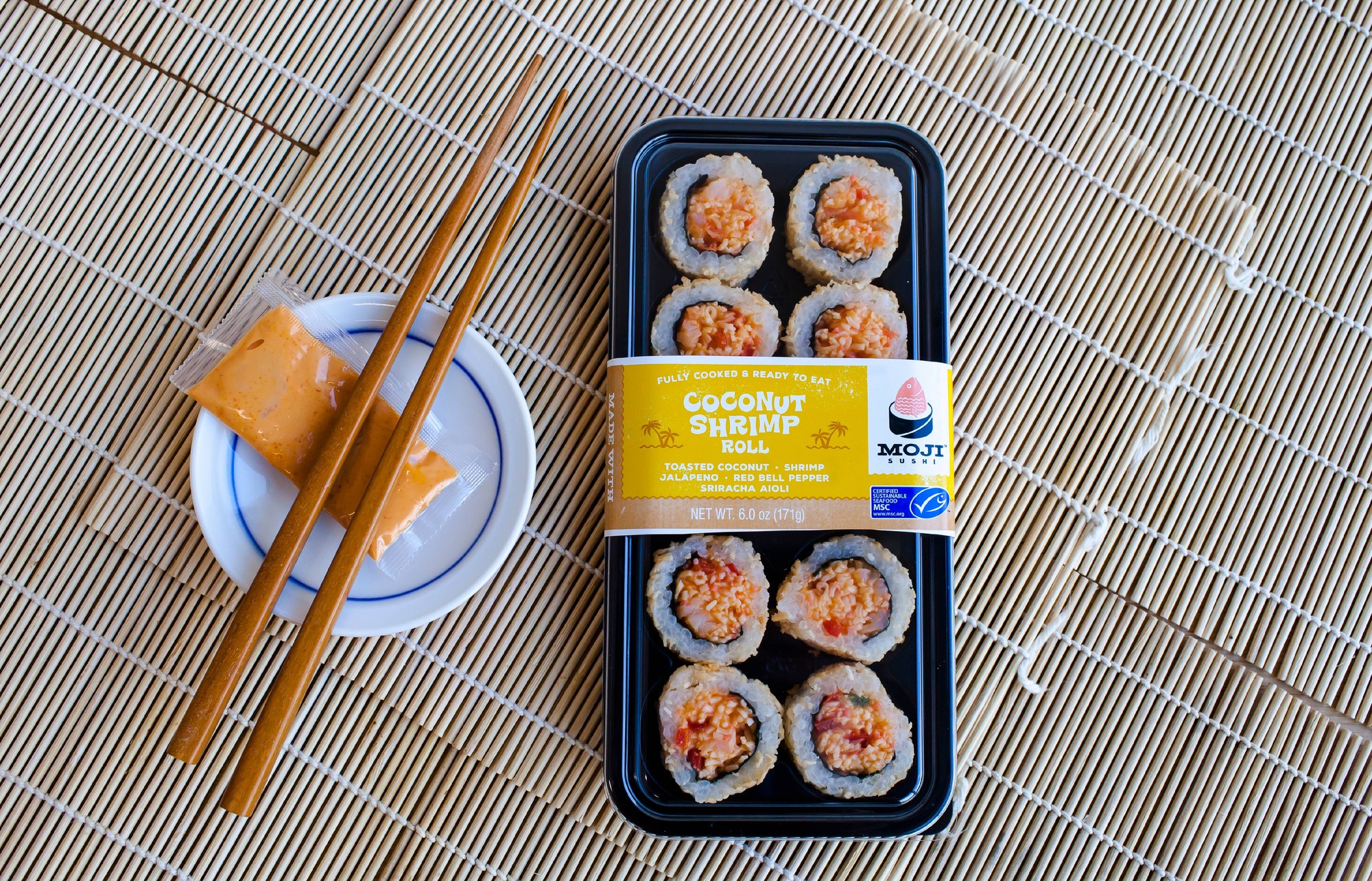 TOASTED COCONUT, SHRIMP JALAPENO, RED BELL PEPPER, SRIRACHA AIOLI COCONUT SHRIMP ROLL, TOASTED COCONUT, SHRIMP JALAPENO, RED BELL PEPPER, SRIRACHA AIOLI