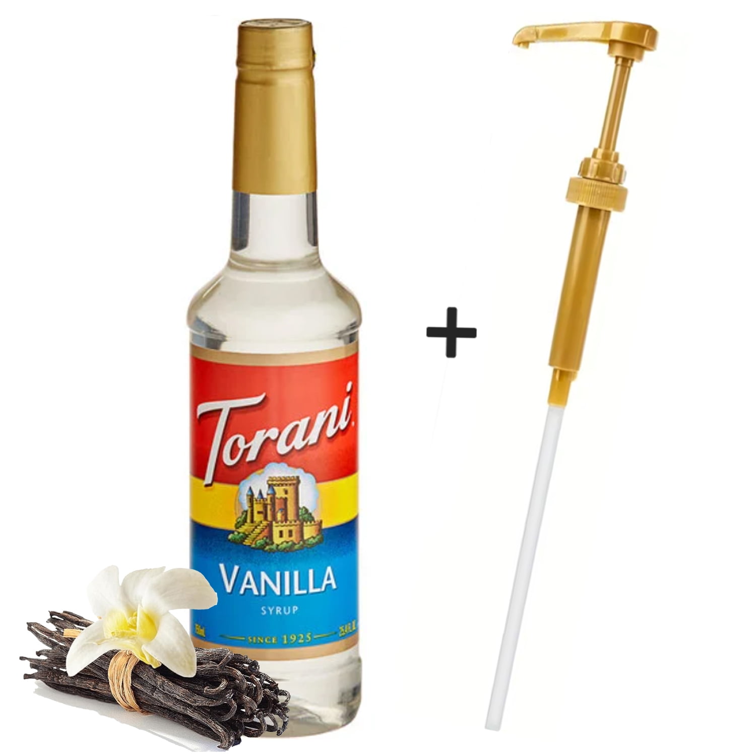 Torani Vanilla Flavoring Syrup, 25.4 oz (750 mL) Plastic Bottle + Gold Syrup Pump