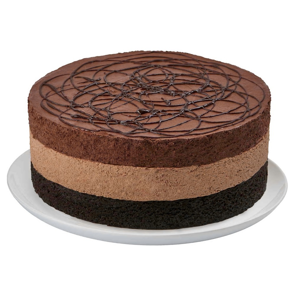 TRIPLE CHOCOLATE CAKE LAYERED WITH MILK AND DARK CHOCOLATE MOUSSE, FINISHED WITH A CHOCOLATY SWIRL MOUSSE TORTES, TRIPLE CHOCOLATE
