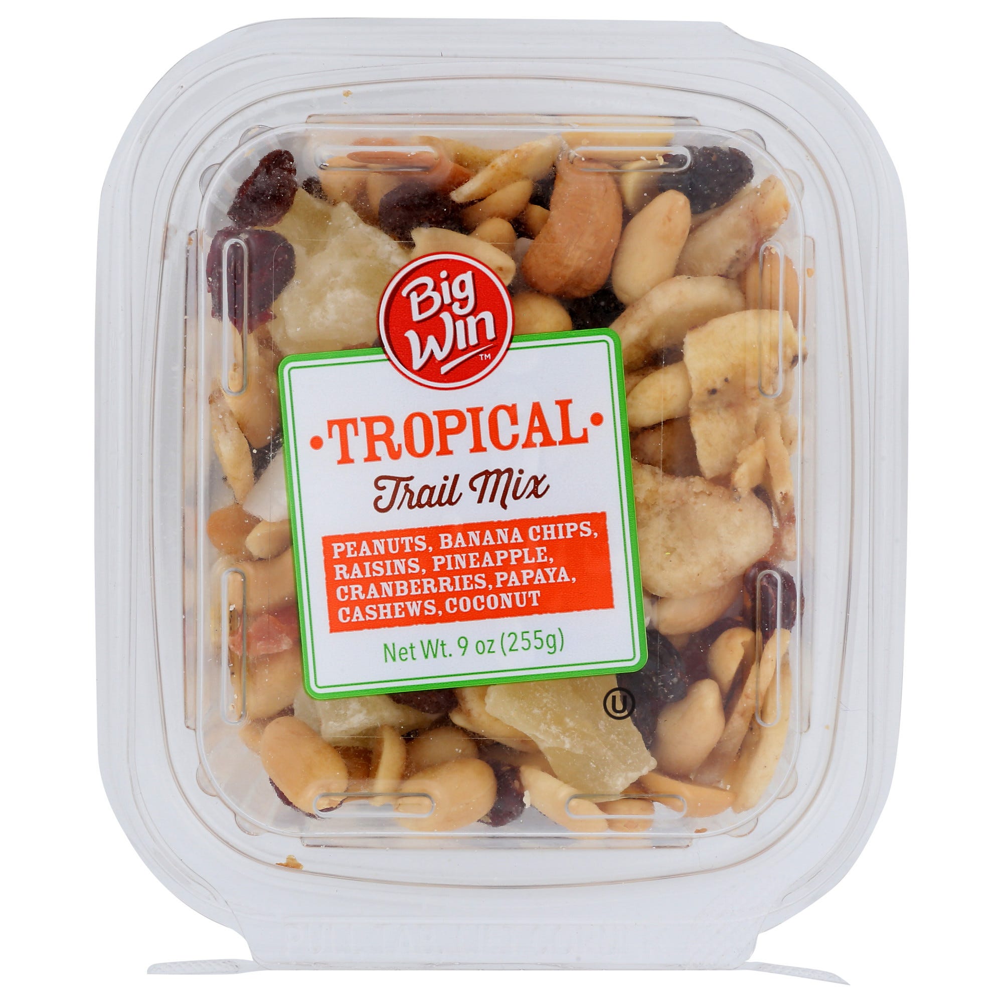 TROPICAL TRAIL MIX PEANUTS, BANANA CHIPS, RAISINS, PINEAPPLE, CRANBERRIES, PAPAYA, CASHEWS, COCONUT, TROPICAL TRAIL MIX