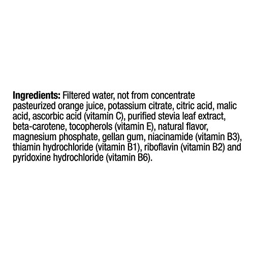 Filtered Water, Not From Concentrate Pasteurized Orange Juice, Modified Food Starch, Citric Acid, Malic Acid, Natural Flavors And Reb A (Pre Via Brand), Vitamins And Minerals: Potassium Citrate, Ascorbic Acid (Vitamin C), Beta-carotene, Tocopherol (Vitamin E), Magnesium Phosphate, Niacinamide (Vitamin B3), Thiamin Hydrochloride (Vitamin B1), Riboflavin (Vitamin B2), Pyridoxine Hydrochloride (Vitamin B6)