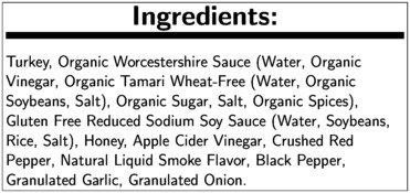 TURKEY, ORGANIC WORCESTERSHIRE SAUCE (WATER, ORGANIC VINEGAR, ORGANIC TAMARI WHEAT-FREE (WATER, ORGANIC SOYBEANS, SALT), ORGANIC SUGAR, SALT, ORGANIC SPICES), GLUTEN FREE REDUCED SODIUM SOY SAUCE (WATER, SOYBEANS, RICE, SALT), HONEY, APPLE CIDER VINEGAR, CRUSHED RED PEPPER, NATURAL LIQUID SMOKE FLAVOR, BLACK PEPPER, GRANULATED GARLIC, GRANULATED ONION.