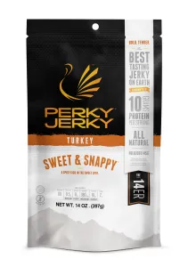 Turkey Perky Jerky 14 oz. Bag - Sweet & Snappy Flavor – Tender, Marinated Jerky – Handcrafted Seasoned Jerky – Soft and Easy to Chew – A Flavorful, High-Protein Snack with 10 Grams of Protein
