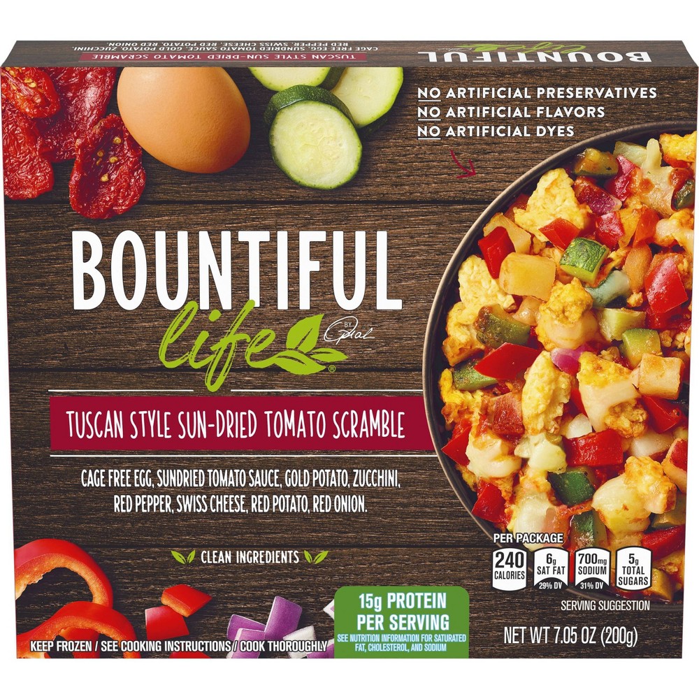 SCRAMBLED EGGS (EGGS, MILK, CORN STARCH, SEA SALT, WHITE PEPPER), RED PEPPERS, ORGANIC POTATOES, ORGANIC ZUCCHINI, WATER, ORGANIC RED POTATOES, SWISS CHEESE (PASTEURIZED MILK, CHEESE CULTURE, SALT, ENZYMES), RED ONIONS, ORGANIC TOMATO PASTE, CONTAINS LESS THAN 2% OF ORGANIC TOMATOES, BASIL, PARMESAN CHEESE ([PASTEURIZED PART SKIM MILK, CHEESE CULTURES, SALT, ENZYMES], POWDERED CELLULOSE [TO PREVENT CAKING]), ONIONS, GARLIC, EXTRA VIRGIN OLIVE OIL, SALT, DISTILLED WHITE VINEGAR, ONION POWDER, SUGAR, CORN STARCH, ROMANO CHEESE FROM COW'S MILK (CULTURED PASTEURIZED PART-SKIM MILK, SALT, ENZYMES), SPICES.