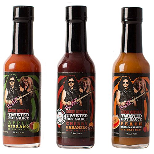 Twisted Hot Sauce Variety Set - 3 / 5 FL OZ Cherry Habanero - Apple Serrano - Peach Carolina Reaper Pepper W/ Twisted Sister Dee Snider / Eddie Ojeda Bulls Eye Guitar Label - Guitar Pick Card of 4 (V)