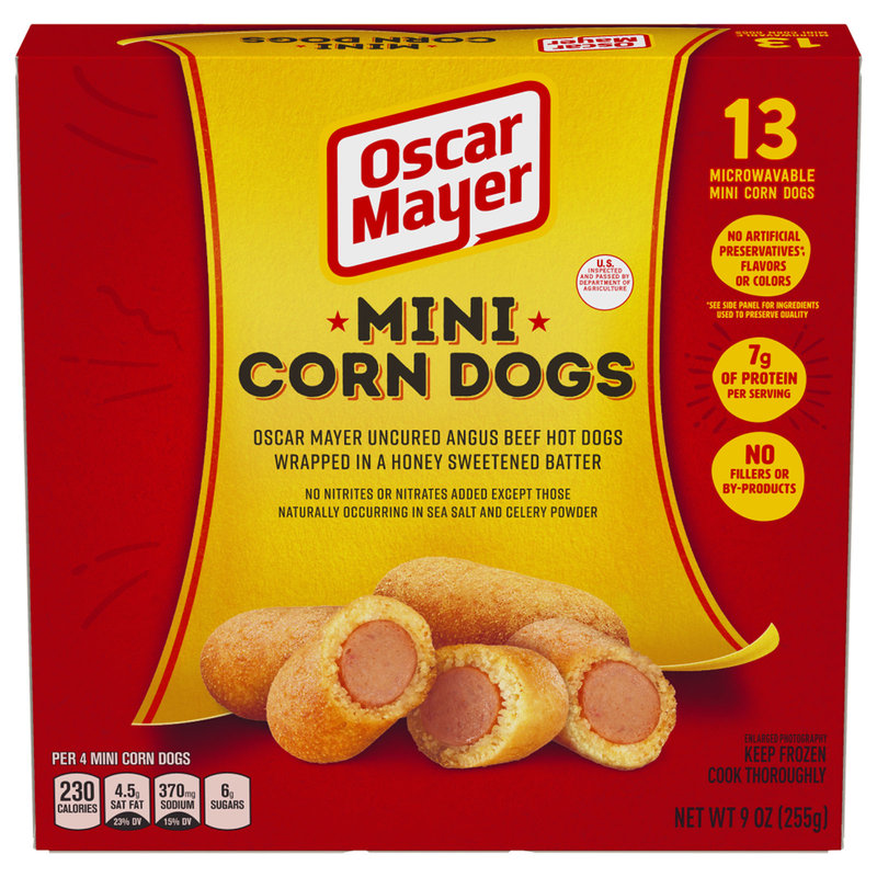 UNCURED ANGUS BEEF HOT DOGS WRAPPED IN A HONEY SWEETENED BATTER MINI CORN DOGS, ANGUS BEEF