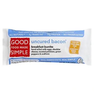 Flour Tortilla (Wheat Flour, Water, Whole Wheat Flour, Palm Oil, Baking Powder, Cane Sugar, Salt, Guar Gum, Non-Gmo Corn Starch), Cage-Free** Eggs (Eggs, Whole Milk, Non-Gmo Corn Starch, Sea Salt, Pepper), White Cheddar Cheese (Pasteurized Cultured Milk, Salt, Enzymes), Uncured Smoked Bacon* (Pork, Water, Sea Salt, Sugar, Celery Powder), Organic White Cheddar Cheese Sauce (Water, Organic Corn Starch, Salt, Organic Cane Sugar, Organic Natural Cheddar Cheese Flavor, And 2% Or Less Organic Canola Oil), Organic Roasted Russet Potatoes (Organic Potatoes With Organic Olive Oil), Organic Salsa (Organic Diced Tomatoes [Organic Tomatoes, Organic Tomato Juice, Sea Salt, Naturally Derived Citric Acid, Calcium Chloride], Organic Diced Onions, Organic Jalapeno Peppers, Organic Vinegar, Organic Lime Juice, Organic Scallions, Organic Cilantro, Organic Corn Starch, Sea Salt, Organic Garlic Powder, Organic Cumin, Organic Black Pepper, Organic Coriander, Organic Chili Powder), Organic Green Peppers, Organic Scallions, Organic Corn Starch. *No Added Nitrates Or Nitrites Except What Naturally Occurs In Celery Powder., **Hens Are Uncaged Inside Barns.