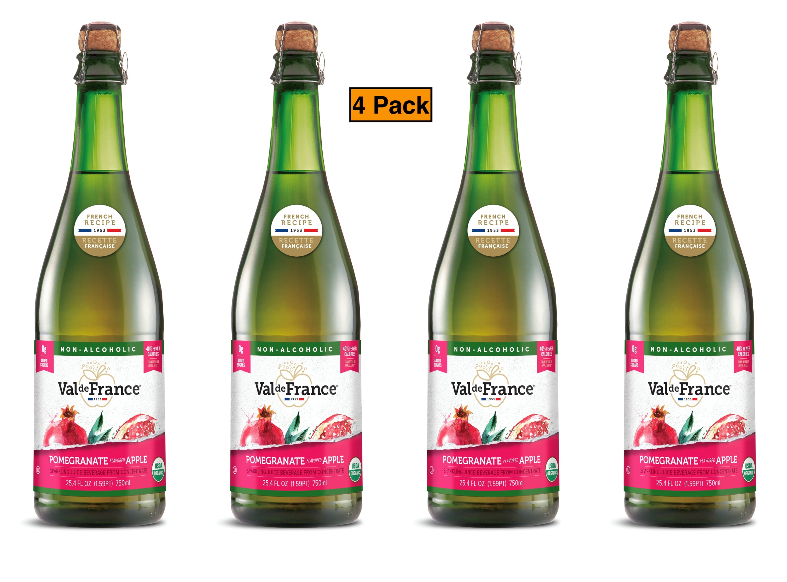 Val de France, Non-Alcoholic, Reduced Calorie, Organic and OU Kosher Sparkling Juice (Pomegranate), 25.4 Fl Oz (Pack of 4)