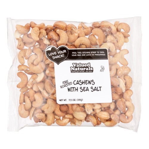 VALUED NATURALS, FIRE ROASTED CASHEWS WITH SEA SALT