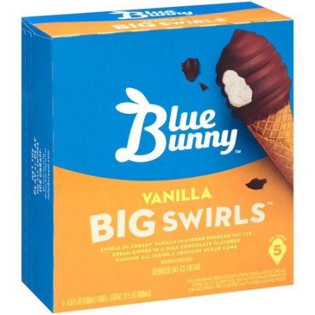 VANILLA FLAVORED REDUCED FAT ICE CREAM DIPPED IN A MILK CHOCOLATE FLAVORED COATING ALL INSIDE A CRUNCHY SUGAR BIG CONES, VANILLA