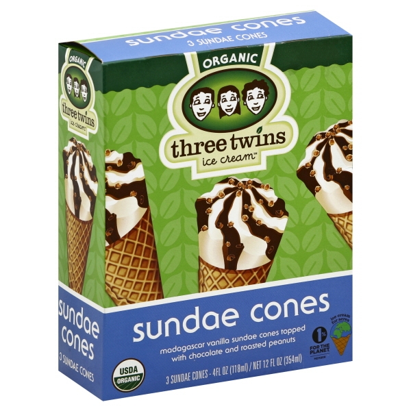 VANILLA ORGANIC SUNDAE CONES TOPPED WITH CHOCOLATE AND ROASTED PEANUTS ICE CREAM, VANILLA