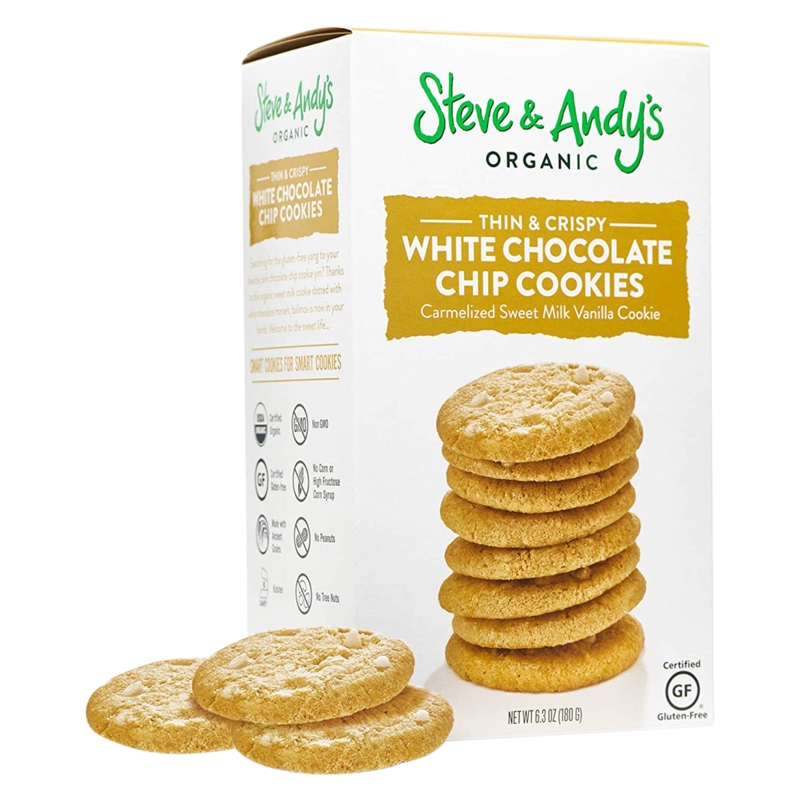 STEVE & ANDY'S ALL PURPOSE ORGANIC & GLUTEN FREE FLOUR MIX (ORGANIC WHITE RICE, ORGANIC SORGHUM, ORGANIC BROWN RICE, ORGANIC TAPIOCA, ORGANIC POTATO STARCH, XANTHAN GUM), ORGANIC EVAPORATED CANE SUGAR, ORGANIC BUTTER, ORGANIC PALM OIL, ORGANIC EGGS, ORGANIC WHITE CHOCOLATE (ORGANIC CANE SUGAR, ORGANIC COCOA BUTTER, ORGANIC WHOLE MILK POWDER, SOY LECITHIN (EMULSIFIER), ORGANIC VANILLA EXTRACT, ORGANIC GROUND VANILLA), PURIFIED WATER, ORGANIC VANILLA EXTRACT, ORGANIC SWEETENED CONDENSED MILK (ORGANIC MILK, ORGANIC SUGAR), BAKING SODA, SEA SALT.