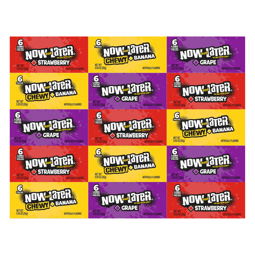 Variety Pack Now and Later Candy, 15 Individually Wrapped Pieces, Long-Lasting Chewy Candy, Includes Banana, Grape, and Strawberry, 0.93 oz per Pack, Perfect for Sharing, Parties, and On-the-Go