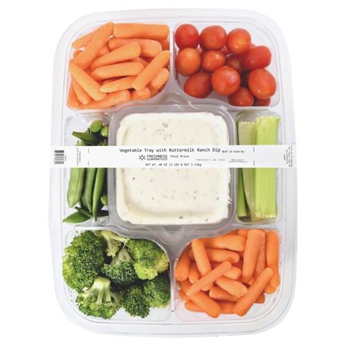 GRAPE TOMATOES, CARROTS, BUTTERMILK RANCH DIP (CULTURED BUTTERMILK, CANOLA OIL, WATER, SOYBEAN OIL, EGG YOLK, SALT, SUGAR, MALTODEXTRIN, CULTURED DEXTROSE, DISTILLED VINEGAR, MODIFIED CORN STARCH, DRIED ONION, DRIED GARLIC, XANTHAM GUM, SPICES, GUAR GUM, MUSTARD FLOUR, YEAST EXTRACT, NATURAL FLAVOR, DRIED GREEN ONION, CORN SYRUP SOLIDS, DRIED BELL PEPPERS, LEMON JUICE CONCENTRATE), CELERY, BROCCOLI FLORETS, SUGAR SNAP PEAS AND/OR CARROTS, SWEET PEPPERS AND/OR CARROTS.