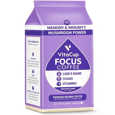 VitaCup Focus Ground Coffee Medium Roast Cognitive & Immunity Support Lions Mane, Chaga Mushroom & B Vitamin - 10oz