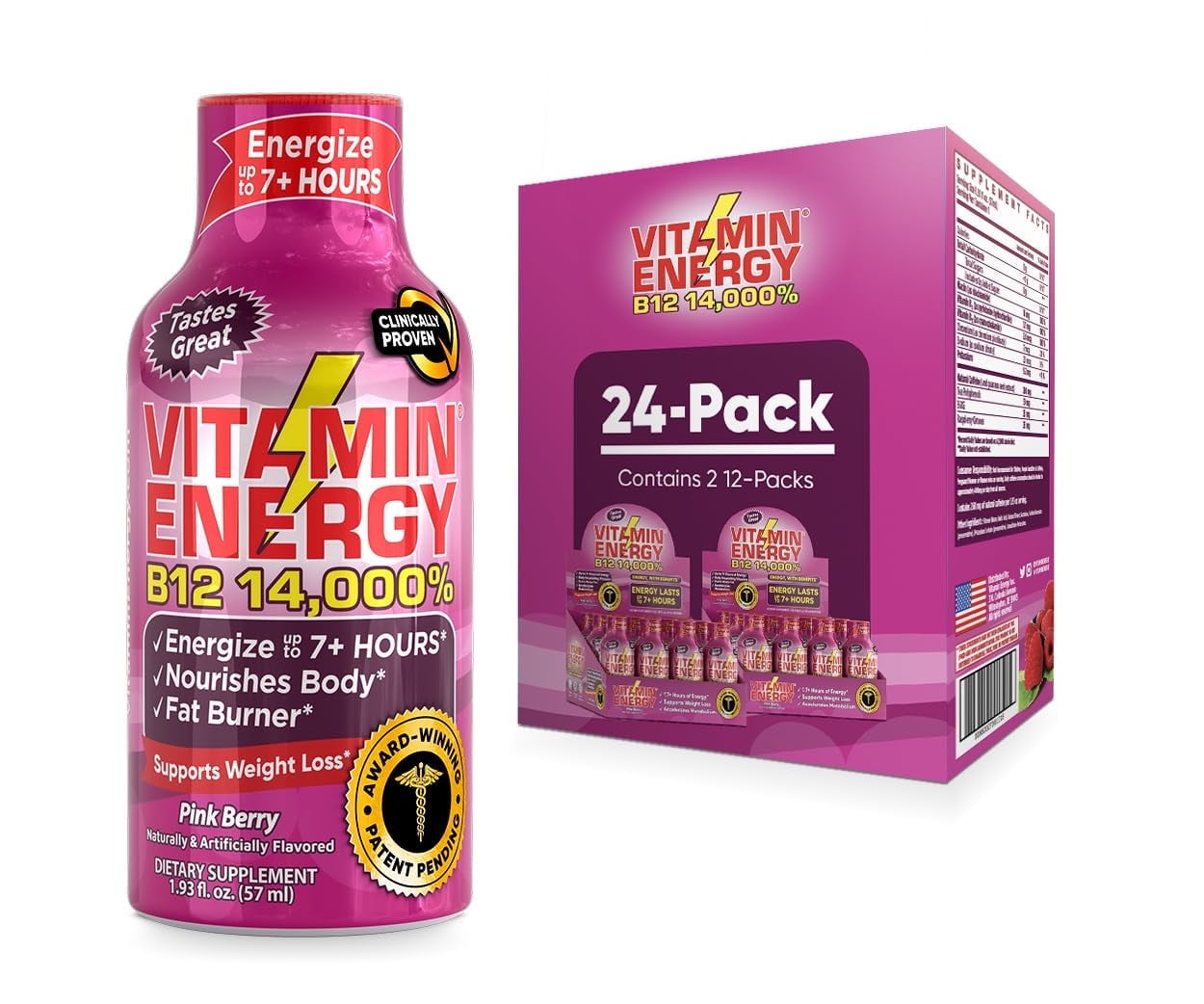 Vitamin Energy B12 Energy Shots, Natural Healthy Energy & Focus Drink, Sugar-Free Carb-Free Supplement, Vitamins B6, B12, Energize up to 7+ Hrs, Pink Berry- 1.93 Fl Oz (Pack of 24)