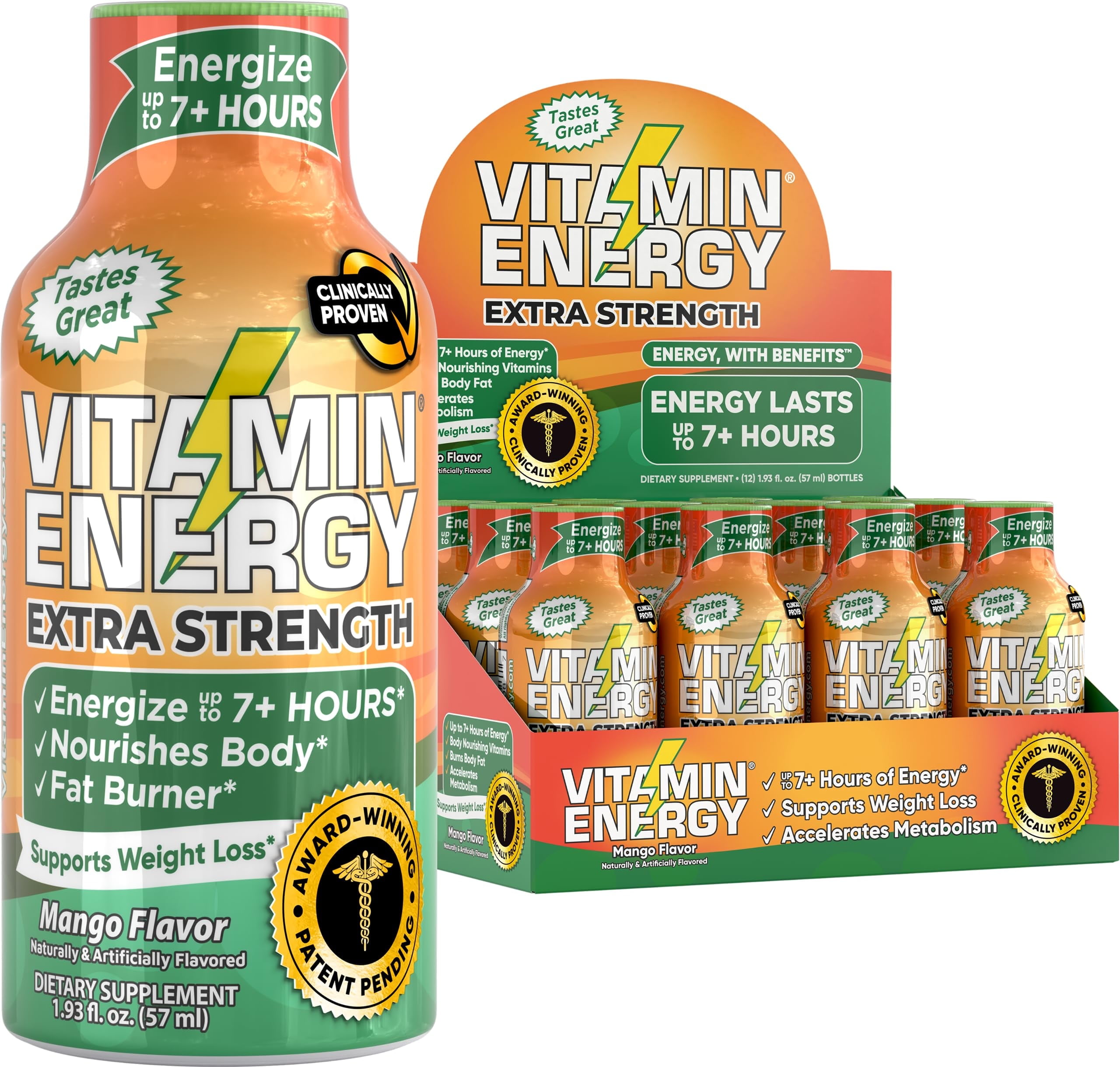 Vitamin Energy Extra Strength Energy Drink Shots, Natural Nutrients to Energize & Support Immune System, Sugar- & Carb-Free, Immunity Formula, up to 7+ Hours, Mango- 1.93 Fl Oz- 12 Count