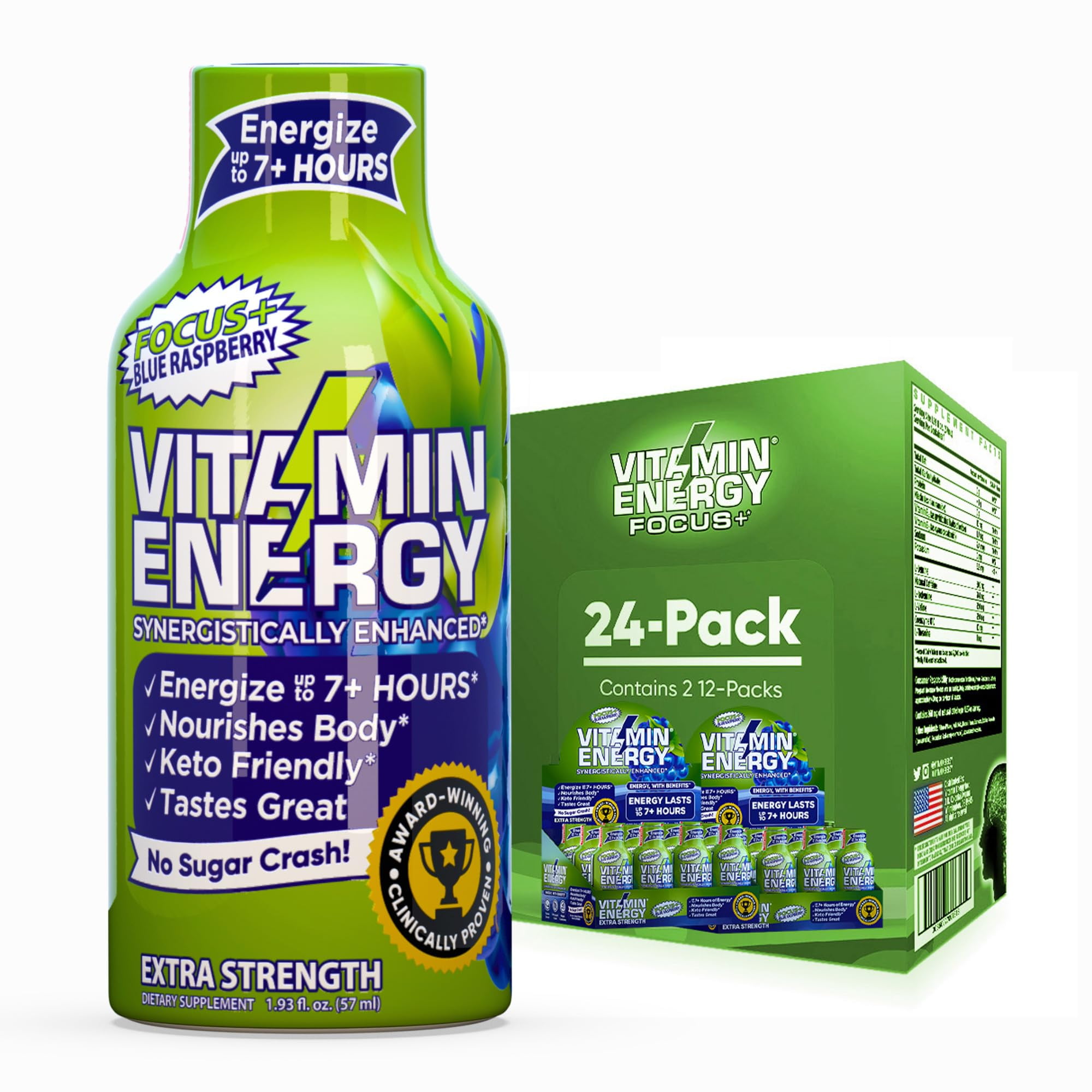 Vitamin Energy Focus+ Energy Shot – Blue Raspberry – 100% DV B-Vitamins & 260mg Plant-Based Caffeine – Zero Calories, Sugar-Free, Vegan – Focus & Productivity Support – 1.93 fl oz, 24-Pack
