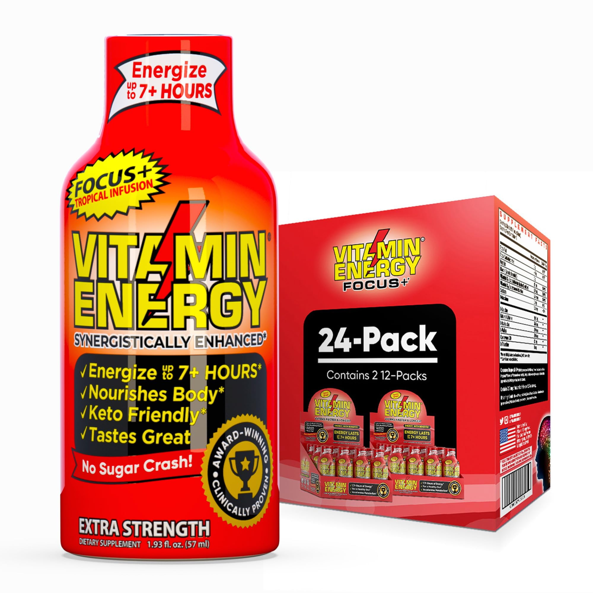 Vitamin Energy Focus+ Energy Shot – Tropical Infusion – 100% DV B-Vitamins & 260mg Plant-Based Caffeine – Zero Calories, Sugar-Free, Vegan – Focus & Productivity Support– 1.93 fl oz, 24-Pack