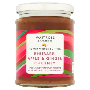 rhubarb, bramley apple, sugar, dark brown sugar, cider vinegar, dried onion, stem ginger (stem ginger, sugar, water), ginger puree, concentrated orange juice, mustard seeds, salt, orange zest, black pepper