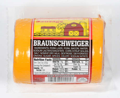 Pork Liver, Pork, Bacon (Cured With Water, Salt, Sugar, Sodium Phosphates, Sodium Erythorbate, Sodium Nitrite), Water, Sodium Lactate/diacetate, Corn Syrup Solids, Salt, Non Fat Dry Milk, Dextrose, Dehydrated Onions, Sugar, Spices, Celery, Sodium N