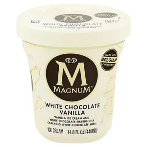 WHITE CHOCOLATE VANILLA ICE CREAM AND WHITE CHOCOLATE SHARDS IN A CRACKING WHITE CHOCOLATE SHELL, WHITE CHOCOLATE VANILLA