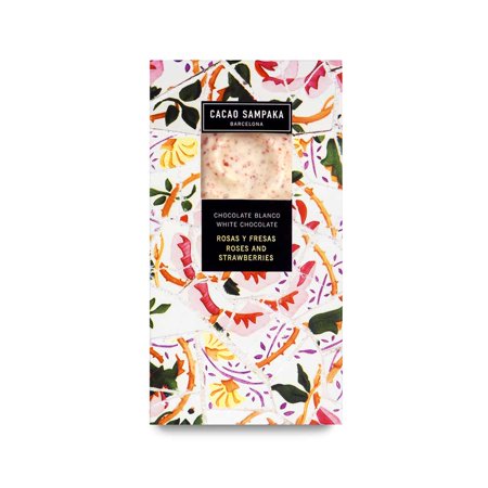 WHITE CHOCOLATE BAR WITH ROSES AND STRAWBERRIES INGREDIENTS: SUGAR, COCOA BUTTER, SKIMMED MILK POWDER, ANHYDROUS MILK FAT, STRAWBERRY, FRUCTOSE, ROSE FLAVOR, CITRIC ACID, EMULSIFIER SOYA LECITHIN, NATURAL VANILLA FLAVOR. COCOA: 33% MINIMUM.