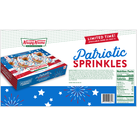 DOUGHNUT (ENRICHED WHEAT FLOUR (WHEAT FLOUR, NIACIN, REDUCED IRON, THIAMINE MONONITRATE, RIBOFLAVIN, FOLIC ACID), WATER, PALM OIL, SOYBEAN OIL, SUGAR. CONTAINS 2% OR LESS OF EACH OF THE FOLLOWING: YEAST, SOY LECITHIN, HYDROGENATED SOYBEAN OIL, MONO- AND DIGLYCERIDES, SALT, WHEAT GLUTEN, MONOCALCIUM PHOSPHATE, DRIED MILK POWDER, CELLULOSE GUM, LECITHIN, MALTODEXTRIN, ASCORBIC ACID, CALCIUM PROPIONATE (TO MAINTAIN FRESHNESS), SORBITAN MONOSTEARATE, TOCOPHEROLS, ENZYMES, OAT FIBER, DRIED EGG YOLKS), ICING (SUGAR, WATER, CORN SYRUP, ARTIFICIAL COLOR, NATURAL FLAVOR, AGAR, POTASSIUM SORBATE (TO MAINTAIN FRESHNESS), CITRIC ACID, MONO AND DIGLYCERIDES, LOCUST BEAN GUM, SALT), GLAZE (SUGAR, WATER, CORN STARCH, AGAR, NATURAL AND ARTIFICIAL FLAVORS, GUAR GUM, LOCUST BEAN GUM, SOYBEAN OIL), SPRINKLES (SUGAR, FRACTIONATED PALM KERNEL OIL, CORN STARCH, GLUCOSE SYRUP, SOY LECITHIN, RED 40, RED 3, BLUE 1, GUM ARABIC, CARNAUBA WAX).