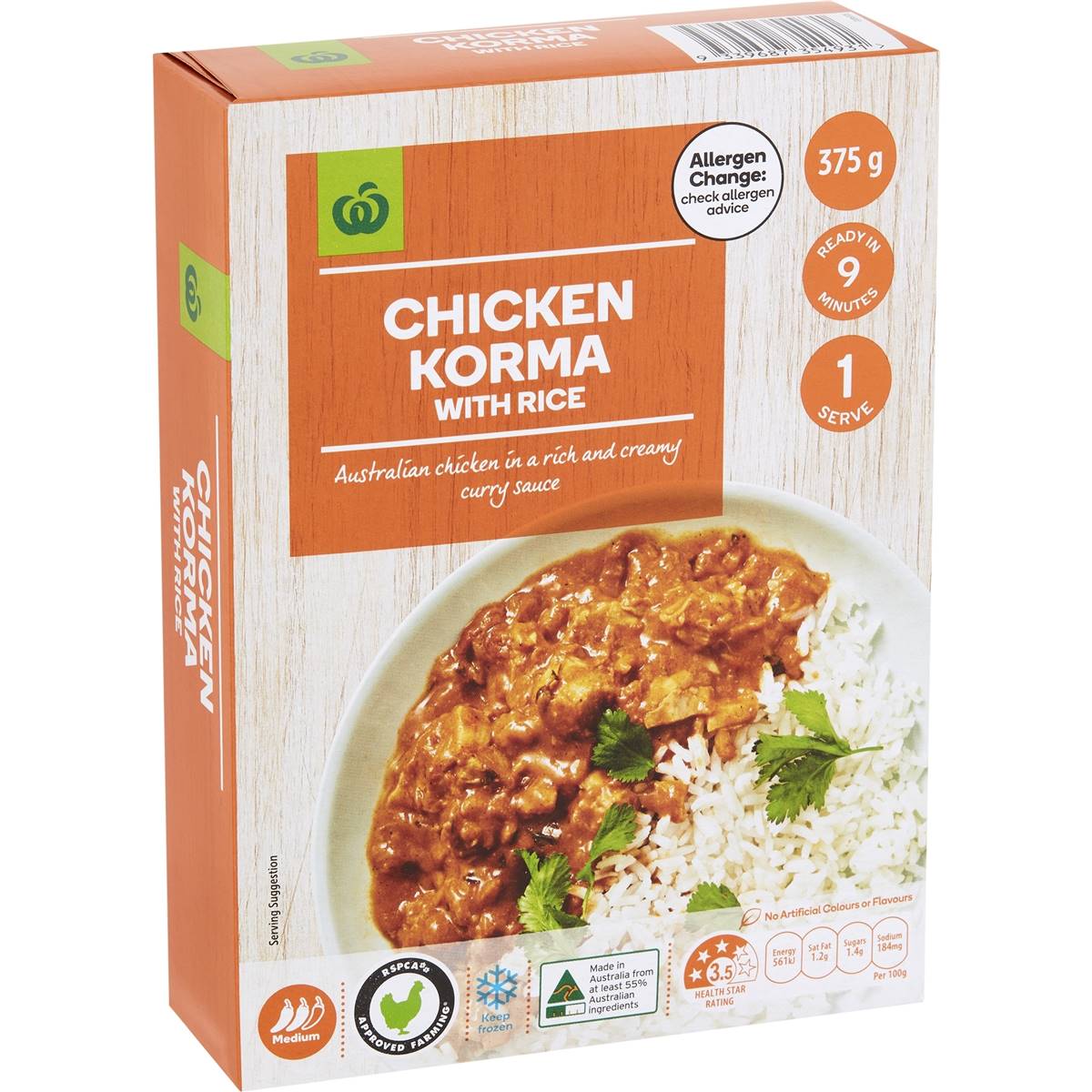 Cooked Rice (48%) (Water, Rice), Korma Sauce (39%) (Water, Onion (9%), Tomato Paste, Cashew Paste (2%), Butter (Milk), Milk Solids, Spices, Thickener (1422), Canola Oil, Ginger, Garlic, Salt, Sugar, Herbs, Inulin), Marinated Cooked Chicken (13%) (RSPCA Approved Chicken (82%), Water, Salt, Sugar, Potato Starch, Corn Starch, Garlic Powder, Onion Powder).