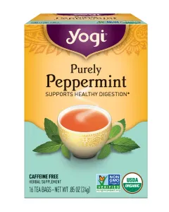 Yogi Purely Peppermint caffeine-free herbal supplement is an organic tea bag containing peppermint leaves. It is inspired by the ancient Greeks and Romans who used mint to soothe their digestion after feasts. People appreciate the flavor of Yogi Peppermint tea and often add cream to enhance its deliciousness. They find the tea to be soothing and express their love for all Yogi teas.